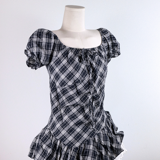Asymmetrical Plaid Puff Sleeve Top