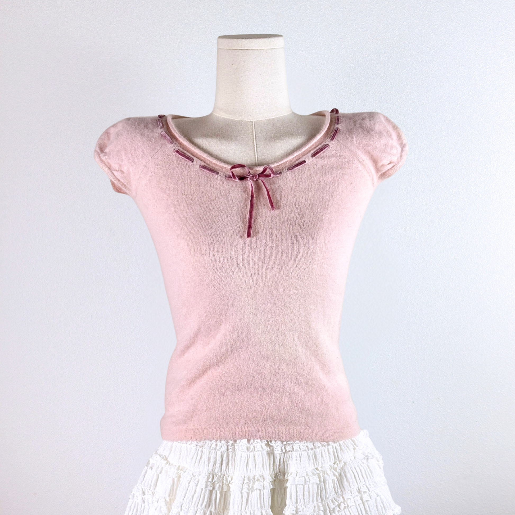 Soft as a daydream and sweet as rose tea, this fluffy pink knit top wraps you in comfort and charm. Delicate velvet ribbon detailing weaves through the neckline, tied in a tiny bow that adds just the right amount of romantic flair. With capped sleeves and a fitted silhouette, it pairs effortlessly with flowy skirts or high-waisted denim for a dreamy, doll-like look. ˖ ࣪⭑