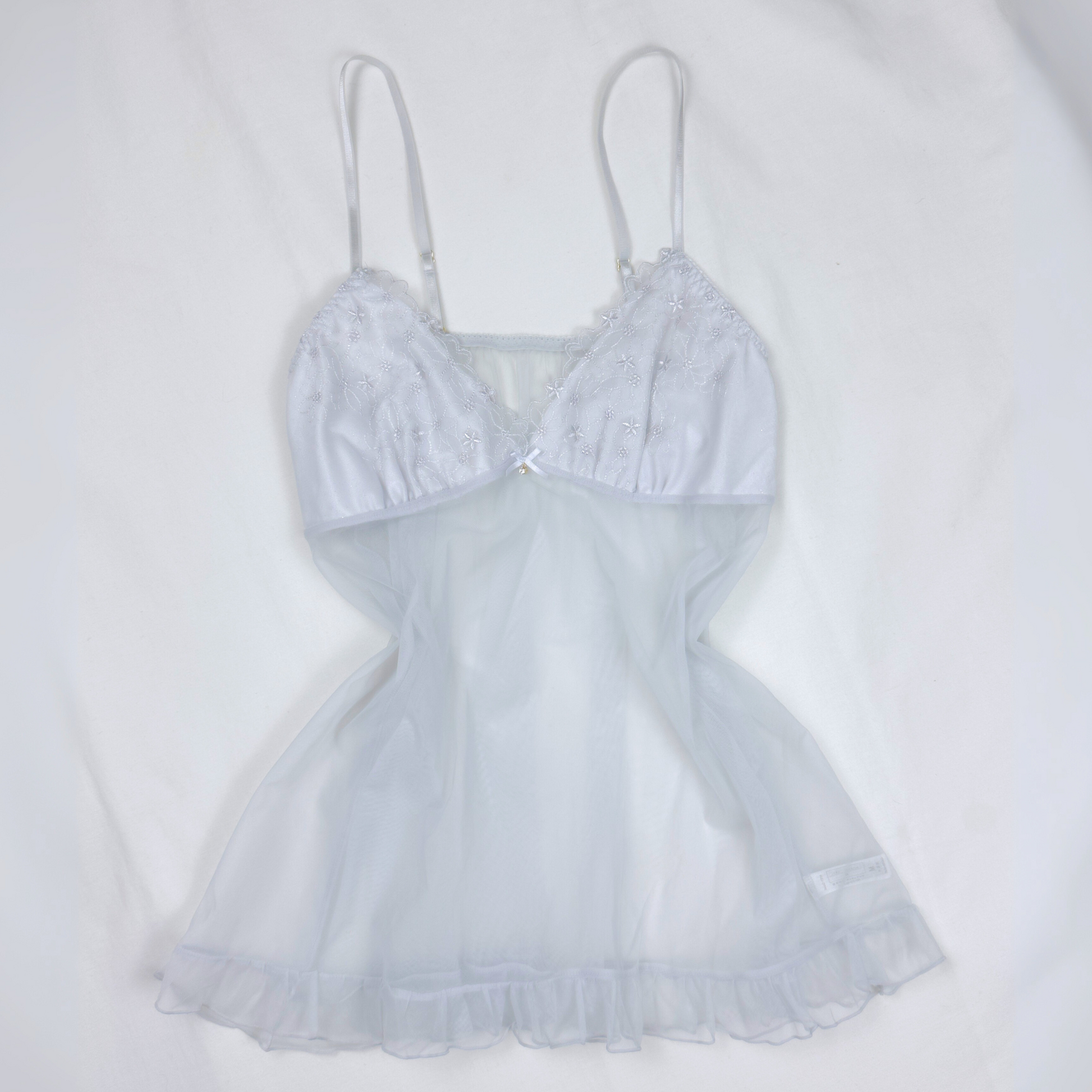 A sheer and floaty camisole in a delicate cloud grey color, featuring a soft tulle overlay and embroidered star detailing across the chest. Feminine, romantic, and dreamy, with subtle ruffle trim along the hem. Lightweight and airy, perfect for layering or wearing on its own.