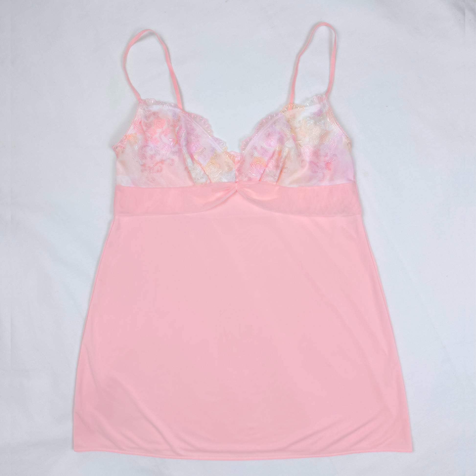 A soft and silky camisole in a sweet peach pink hue. The bodice features intricate floral embroidery in pastel tones over sheer mesh cups, offering a romantic and delicate look. The smooth skirt flows effortlessly, making it perfect for lounging or layering. A flattering empire waistline and subtle shine throughout elevate its feminine charm.