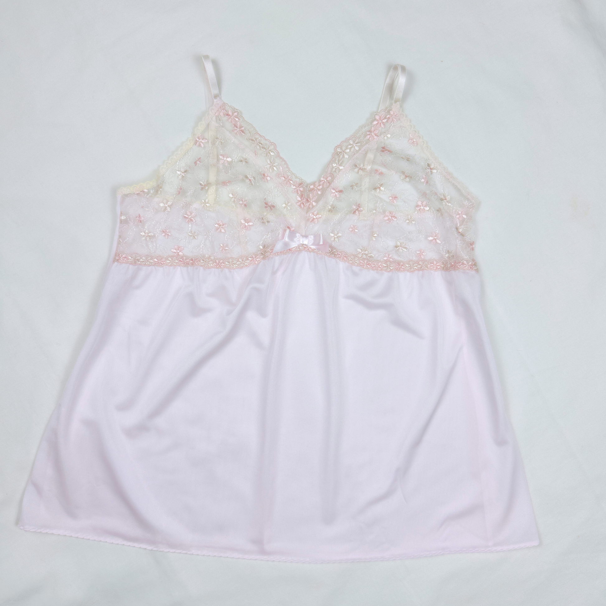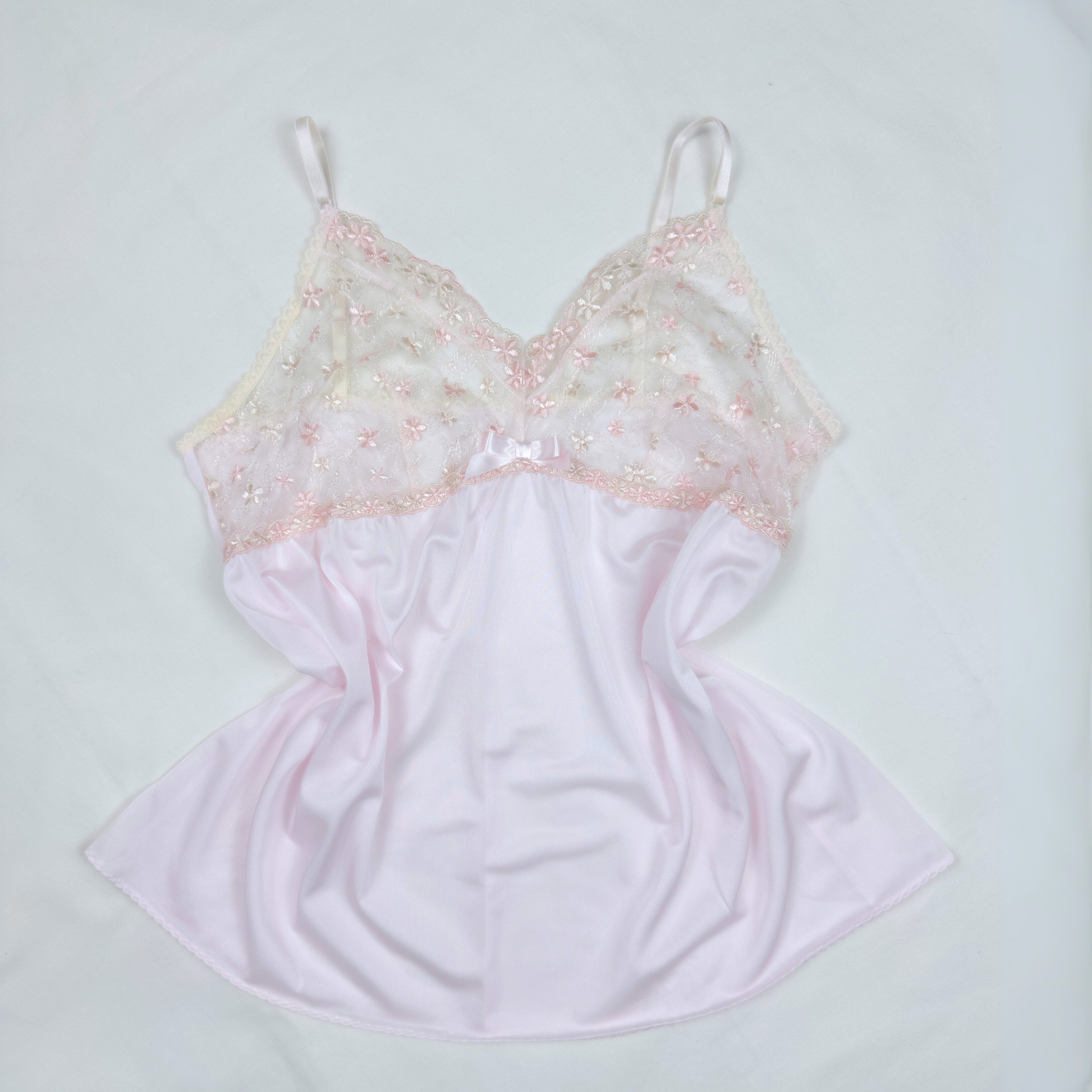 A dreamy camisole in a baby pink tone, featuring an ivory lace bust embroidered with delicate pastel pink florals. Finished with a satin ribbon bow at the center and a light, silky drape perfect for layering or lounging.